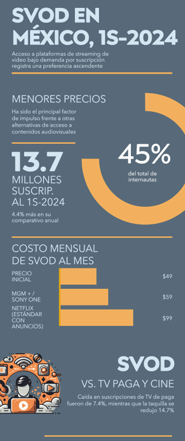 | El acceso a contenidos audiovisuales vía plataformas de streaming de video bajo demanda por suscripción (SVOD por sus siglas en inglés) continúa aumentando su preferencia en el acceso a contenidos audiovisuales en México. Ello a partir de su competitividad tarifaria, exclusividad en el estreno y transmisión de títulos, diversificación en sus planes y formas de contratación, así como la creciente adopción de la conectividad y sus diferentes dispositivos de acceso. En números absolutos, la contabilidad de suscripciones a plataformas SVOD ascendió a 13.7 millones en la primera mitad de 2024, cifra 4.4% superior en su comparativo anual, un ligero repunte en el crecimiento registrado en periodos anteriores. Esta disponibilidad de cuentas habilita el acceso a contenidos por suscripción a 43 millones de internautas (45% del total), al realizar un pago periódico ya sea de forma directa o través del empaquetamiento con servicios de telecomunicaciones u otras suscripciones digitales. Plataformas SVOD vs. Vías Tradicionales de Acceso a Contenidos Precisamente, las condiciones de oferta referidas no sólo han impulsado la preferencia de las plataformas SVOD, sino que han impactado negativamente a otras formas tradicionales de acceso a contenidos audiovisuales. Una de las principales causales de impulso en la contratación de plataformas SVOD es el precio mensual que comienza desde los $49 pesos al mes. Entre los casos más asequibles destaca MGM+ y Sony One, ambas de reciente incursión en el mercado mexicano, con un costo de $59 pesos. Adicionalmente, la diversificación de planes a un menor precio con anuncios desde $99 pesos al mes (Netflix), han intensificado la competitividad tarifaria de estas alternativas de acceso a contenidos audiovisuales. Otra de las ventajas que han incentivado a la contratación de plataformas de streaming por suscripción es la creciente disponibilidad de contenidos originales de estreno y la transmisión de eventos deportivos y realities en vivo. El acortamiento de las ventanas de exhibición de las películas de estreno directamente en jugadores SVOD que en ocasiones llega a ser tan pronto como 45 días después de su estreno en cines, ha sido factor para que los usuarios opten por esperar a su disponibilidad en streaming, antes que acudir a disfrutar del contenido en la pantalla grande. Todo ello, ha provocado que los hogares y personas en México opten de manera creciente en hacerse de una suscripción a plataformas SVOD, frente a contar con el servicio de TV de paga o incluso a acudir al cine de forma recurrente. Esto último se ve reflejado en los números de suscripciones a la TV restringida que alcanzan 17.2 millones al cierre de la primera mitad de 2024 y que resultaron ser 7.4% inferiores en su comparativo anual. Mientras que en el mismo periodo, la cantidad de boletos vendidos (139 millones) e ingresos de taquilla ($9,583 mdp) se contrajeron 14.7% y 12.3%, respectivamente, de acuerdo con cifras de la Cámara Nacional de la Industria Cinematográfica (Canacine). |
