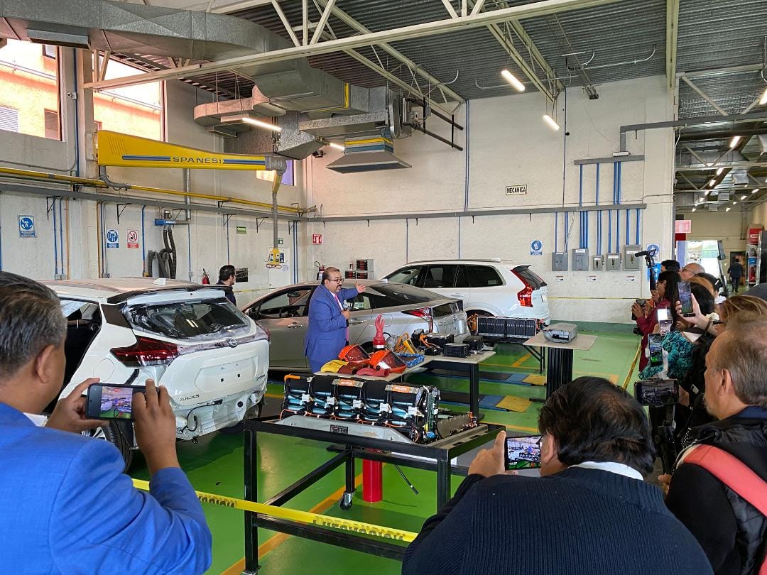 Tanto en la ponencia como en la demostración, el ingeniero Sosa mostró los avances en la construcción del próximo laboratorio de baterías de vehículos híbridos y eléctricos, enseguida explicó las diferencias y clasificación de los vehículos híbridos y electricos; aclaró por qué es fundamental que los técnicos mecánicos antes de cualquier intervención inhabiliten el flujo de alto voltaje de las baterías. Añadió que el manejo y la manipulación de componentes de vehículos híbridos y eléctricos solo debe realizarse por personal debidamente capacitado y equipado para que no sufran una descarga o provoquen una falla en el sistema. De ahí que sea tan importante la capacitación para relalizar diagnósticos correctos que conduzcan a reparaciones eficientes.