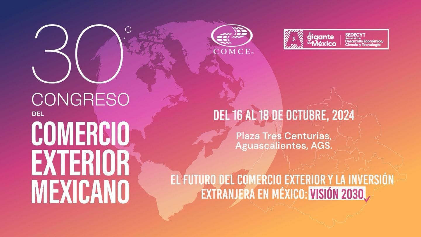 Ciudad de México, septiembre de 2024.- Sergio E. Contreras Pérez, Presidente Ejecutivo del Consejo Mexicano de Comercio Exterior, Inversión y Tecnología (COMCE), dio a conocer que el 30º Congreso del Comercio Exterior Mexicano, organizado por este organismo, contará con la participación de más de 500 líderes empresariales y funcionarios públicos de alto nivel, quienes se darán cita en Aguascalientes del 16 al 18 de octubre de 2024, en la Plaza de las Tres Centurias.
