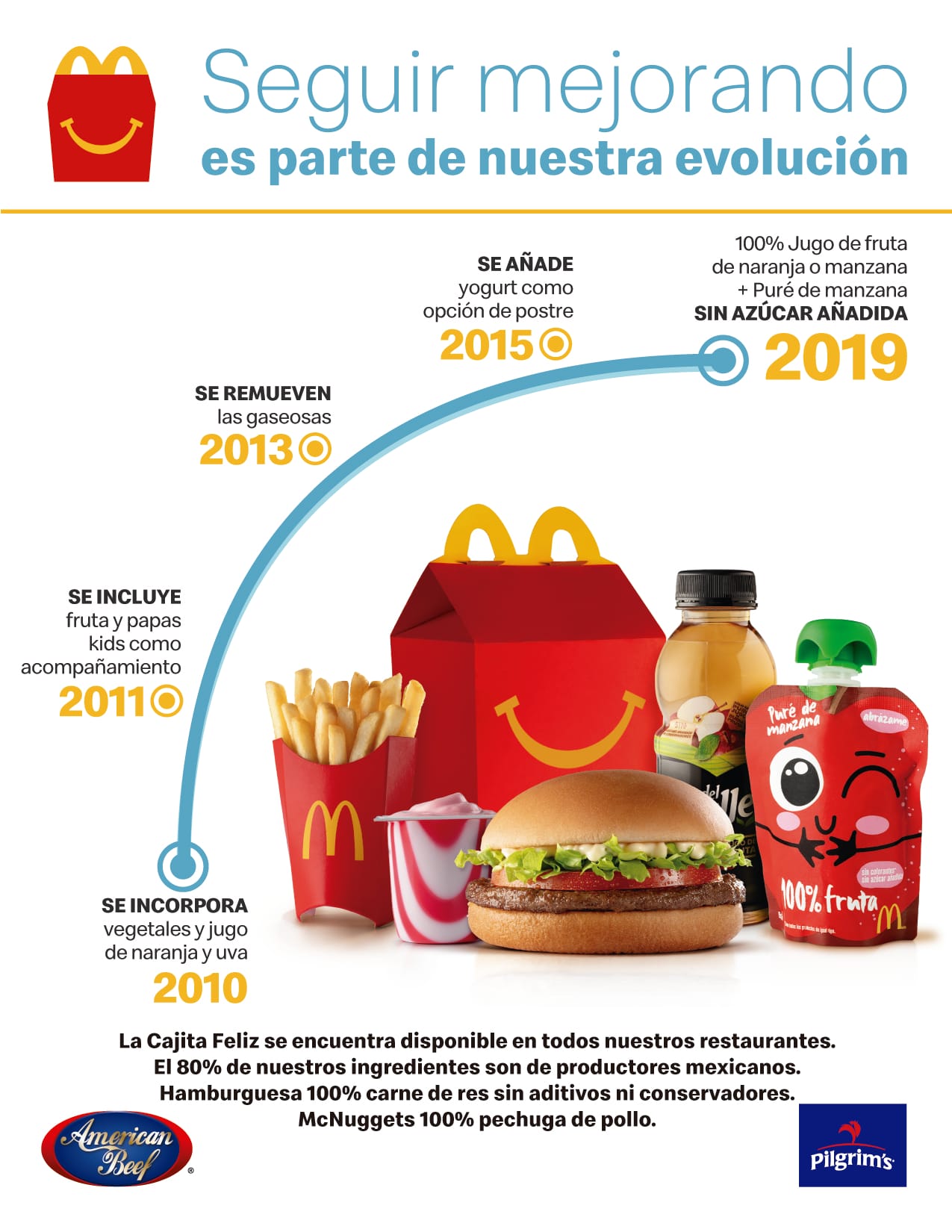 McDonald’s continuará evolucionando con novedades en su menú infantil ya que estos cambios son parte de un plan a largo plazo. Por eso, seguirá trabajando en base a los grupos de alimentos que la Organización Mundial de la Salud recomienda para incorporar a una dieta balanceada como son los granos enteros, proteínas magras, lácteos y más frutas, verduras y vegetales. A la vez,  se mantendrá enfocado en ofrecer más novedades a través de empaques innovadores y formatos más lúdicos, para que la Cajita Feliz sea cada vez más nutritiva y divertida.