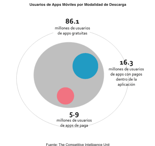 Por modalidad de descarga, la totalidad de usuarios de aplicaciones cuentan con al menos una de acceso gratuito. Este tipo de aplicaciones basan su modelo de negocio de generación de ingresos en ofertas publicitarias, y en muchas ocasiones para utilizar la aplicación es necesario ver videos, imágenes o entrar a enlaces publicitarios.