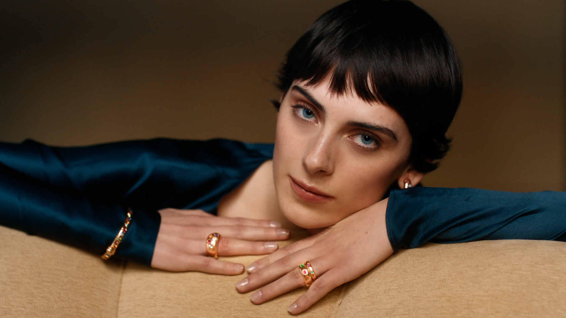 El oro, pulido con una suavidad sedosa y táctil, envuelve el dedo con una presencia firme pero natural, mientras que el equilibrio de proporciones revela un savoir-faire que trasciende lo visible. Es en este lienzo donde el color cobra vida, una firma inconfundible de Pomellato, expresándose en tríos de piedras preciosas que dialogan entre sí con armonía y carácter.