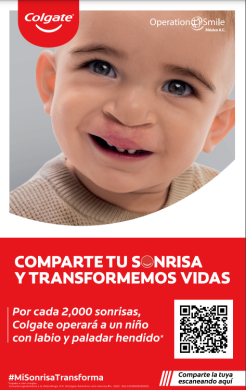 | Colgate cumple con su propósito de transformar la vida de cientos de personas a través del poder de la sonrisa.Invitan a los mexicanos a donar sus sonrisas a través de sus redes sociales o colgate.com para transformarlas en cirugías.En México cada año nacen 3 mil 500 niños y niñas con labio y/o paladar hendido. Colgate, de la mano de Operation Smile México, A.C., unen esfuerzos para llevar a cabo 100 operaciones para transformar sus vidas. |