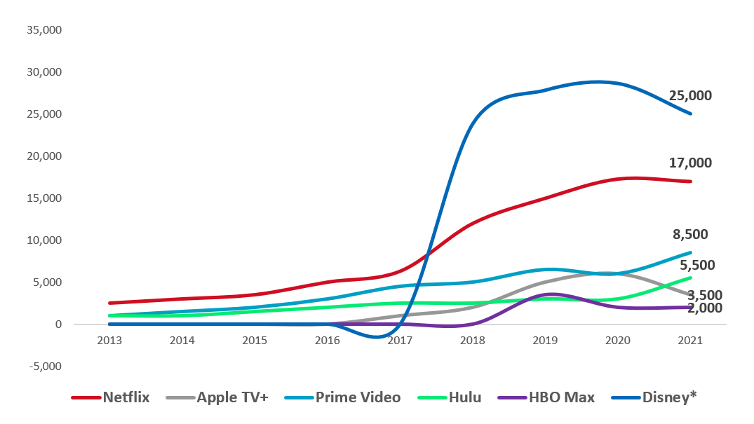 | Las autoridades regulatorias de México y EUA han aprobado la concentración de TelevisaUnivision. En una primera instancia, fue el Instituto Federal de Telecomunicaciones (IFT) en México la entidad que aprobó la integración de estos dos jugadores en septiembre de 2021, sin advertir efectos contarios a la competencia en los sectores de telecomunicaciones y radiodifusión. Mientras que la institución homóloga en EUA, la Federal Communications Commission (FCC) dio su visto bueno en días recientes, a partir del cual se anunció la creación del conglomerado de contenidos para mercados de habla hispana más grande del mundo, que deriva del vasto acervo y experiencia de dos líderes históricos. Esta operación sin precedentes busca fortalecer el posicionamiento competitivo de las producciones en español a nivel global, a través de una multiplicidad de plataformas y servicios de entretenimiento, que incluye canales de televisión abierta, de TV de paga, estaciones de radio y plataformas digitales de audio y video. Por el lado de Televisa, la integración incluye cuatro canales de televisión abierta de Televisa, los 27 canales que ostenta en TV de paga, el estudio de cine Videocine, el servicio de video bajo demanda por suscripción (SVOD, por sus siglas en inglés) Blim TV. Mientras que los activos de Univision en Estados Unidos suman los canales Univision y UniMás, nueve canales de cable en español, 59 estaciones de televisión y 57 estaciones de radio en los principales mercados hispanos de Estados Unidos y su servicio de streaming bajo demanda con publicidad (AVOD, por sus siglas en inglés) PrendeTV. Esta integración estratégica se suma al capítulo de fusiones y combinación de activos que ha tenido lugar en el mercado de creación y distribución de contenidos audiovisuales para fortalecer el alcance y huella de mercado de empresas de medios a nivel global, como son los casos de Disney-Fox y de Warner Bros. Discovery. Alcances del Conglomerado La suma y multiplicación de recursos creativos, de capital, infraestructurales, entre otros de TelevisaUnivision habilitarán la provisión directa de contenidos audiovisuales a más de 600 millones de personas de habla hispana en todo el mundo, una elevada proporción de ellos tan sólo en Norteamérica. El total representa la cuarta audiencia más grande del mundo por el idioma hablado, después del inglés, el chino mandarín y el hindi. TelevisaUnivision combinará la biblioteca de contenido en español más extensa del mundo con 300,000 horas de contenido, que supera en aproximadamente 100 veces el total de Netflix en todo el mundo. Sinergias y Eficiencias Operativas Se estima que TelevisaUnivision será una empresa que alcanzará ingresos conjuntos en el orden de $4,000 millones de dólares, 12% superiores a los registrados por Netflix correspondientes al pago de suscripciones en Latinoamérica en todo 2021 y ganancias antes de intereses, impuestos, depreciaciones y amortizaciones (EBITDA, por sus siglas en inglés) por $1,600 millones de dólares. Ello permitiría la realización inversiones en la generación de nuevos contenidos originales cercanas a las de otros jugadores en el ecosistema global de plataformas de streaming, por ejemplo, HBO Max y Apple TV+ que destinaron $2,000 y $3,500 millones de dólares respectivamente, durante 2021.Inversión Mundial en Contenidos Audiovisuales por Plataforma (Millones de Dólares) |
