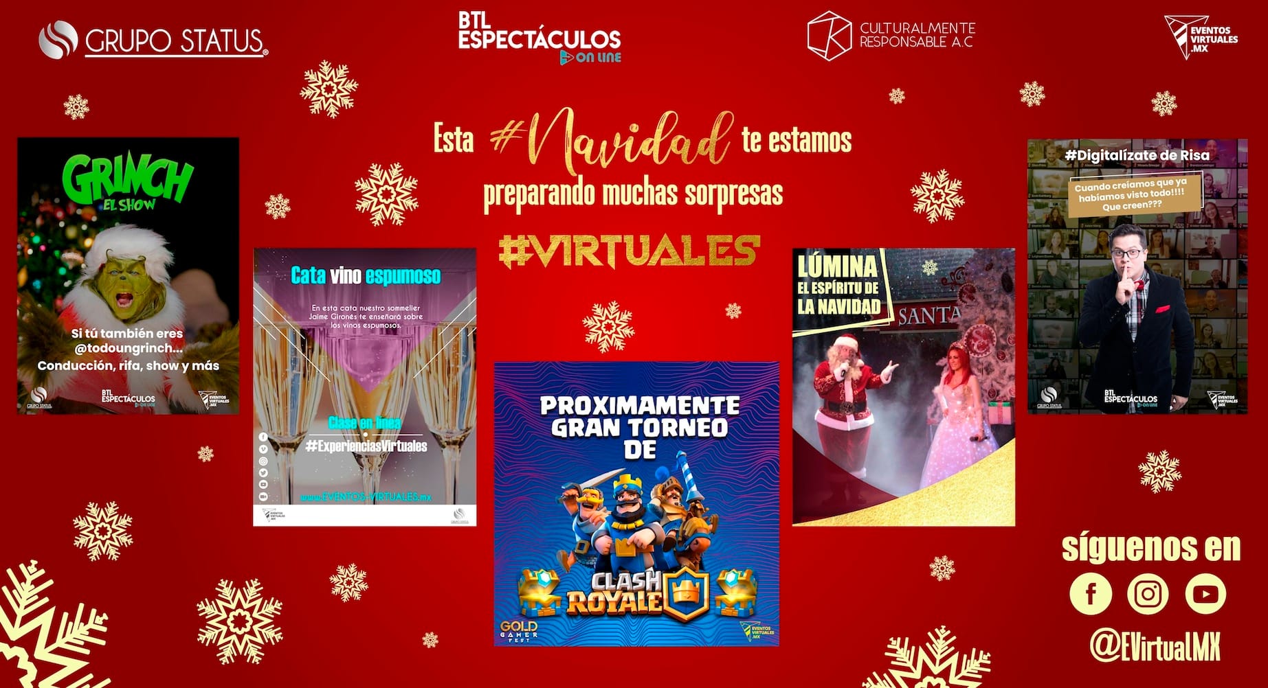 GRUPO STATUS, con más de 20 años realizando eventos presenciales, desarrolló recientemente la empresa EVENTOS VIRTUALES MX y en alianza con Culturalmente Responsable AC, Incident y BTL Espectáculos, presenta una propuesta integral con trasfondo social y económico favorable para el público y a la vez para el gremio artístico y cultural tan golpeado en estos tiempos de COVID.