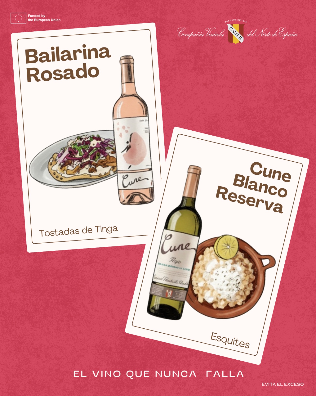 Bailarina Rosado con Tostadas de Tinga De viñedos jóvenes de Rioja Alta surge este rosado vibrante, elaborado con viura, tempranillo y garnacha. Su vinificación lenta preserva los aromas de cada variedad, dando como resultado un vino fresco, ligero y de gran expresión. Bailarina se convierte en el acompañante perfecto de unas tostadas de tinga, su acidez contrasta con la untuosidad de la preparación del pollo en chipotle, mientras que sus notas frutales suavizan el picante potenciando el carácter ahumado del platillo. Un maridaje que baila entre frescura y picante, dejando un alegre recuerdo. Cune Blanco Reserva con EsquitesCune rescata una tradición olvidada de los blancos criados en barrica con este vino fermentado en hormigón y madera, criado durante 18 meses y afinado en botella. Con cuerpo, volumen y vigor, este vino se enriquece de notas sutiles de lías, barrica y fruta madura. Frente a él, un vaso de esquites con epazote, chile y limón parece simple, pero esconde capas de sabor que encuentran eco en la estructura del vino. Un maridaje inesperado y profundamente evocador.Cada combinación, demuestra que los vinos de CVNE se convierten en cómplices de todo tipo de antojos y momentos que han encontrando en México un sinfín de oportunidades para disfrutarlos y para reinterpretarse y celebrar la riqueza de dos mundos que se unen en la mesa. |