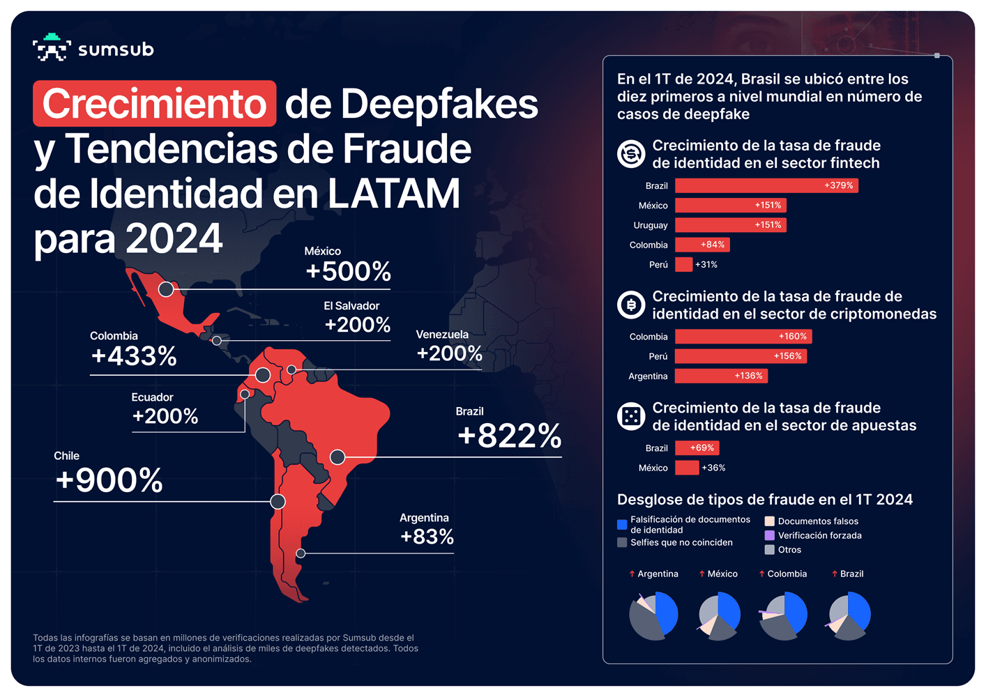 * Nota sobre la fuente El contenido de este comunicado de prensa se basa en estadísticas detalladas y análisis de millones de verificaciones realizadas por la plataforma de Sumsub desde el primer trimestre de 2023 hasta el primer trimestre de 2024, destacando con precisión las tasas actuales de incidencia de fraude. Esto incluye el análisis de miles de casos de deepfakes detectados. Todos los datos internos fueron agregados y anonimizados con el propósito de publicar estos hallazgos.