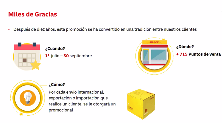 La campaña estará vigente de julio a septiembre en las más de 715 tiendas de DHL Express en México y podrán participar todos los clientes que realicen su primer envío y hasta tres envíos internacionales gestionados desde México, otorgándoles diferentes regalos. La promoción será válida al momento de realizar el pago del envío, ya sea en efectivo, tarjeta de crédito o débito.