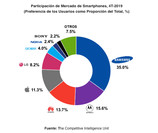 | La creciente contratación de conectividad móvil, ubicua y permanente ha provocado la masificación y muy próxima, adopción de dispositivos móviles inteligentes o Smartphones entre los mexicanos. A partir de la reducción de tarifas por consumo de datos móviles tanto en la modalidad de postpago como en aquella de prepago, registrada desde 2016, ha repuntado de manera sistemática el consumo de MB promedio por usuario en redes móviles. Al cierre de 2019, cada usuario en México consumió en promedio 3,062 MB, lo que representa un crecimiento anual de 50.6%. Lo que evidencia la creciente demanda por esta vía de conectividad. Tenencia de Smartphones Es así como, al cuarto trimestre de 2019 (4T-2019), se contabilizan un total de 111 millones de Smartphones en activo, cifra equivalente a una adopción de 89.4% del total de líneas móviles y 4.1% más con respecto al año anterior. Un mercado que alcanza este nivel de masificación y que continúa con su dinámica de avance e innovación, se ha convertido en uno francamente atractivo para los fabricantes de estos dispositivos. De esta manera, año con año hemos sido testigos de la dedicación esfuerzos por ofrecer renovaciones tecnológicas en línea con las necesidades de conectividad y entretenimiento de los usuarios, para así competir y hacerse de una mayor huella de mercado, en términos de preferencia de los consumidores. Fabricantes de Smartphones: Preferencia de los Usuarios En México, Samsung es el fabricante que cuenta con la mayor preferencia de los usuarios en el mercado. Al cierre de 2019, 35% de los usuarios contaban con un dispositivo de esta marca. Samsung se ha convertido en una empresa punta de lanza en tecnología al ofrecer una incesante renovación en sus equipos. Al mismo tiempo, que cuenta con una oferta vertical, al cubrir las exigencias no sólo del segmento de usuarios de mayor exigencia y ofrecer dispositivos con características similares a las que cuentan sus teléfonos insignia en todas las gamas. Todo ello, le ha permitido posicionarse como el fabricante favorito de los mexicanos. Seguido de Samsung encontramos a Motorola con 15.6% del total de la participación del mercado de Smartphones. Este fabricante, se ha enfocado en los usuarios de gama media, que representan 56% de los Smartphones en activo. Ello al ofrecer equipos con capacidades cercanas a las de equipos insignia, pero a menores precios. En tercer lugar, se ubica Huawei, fabricante que en pocos años se convirtió en un líder de la innovación en Smartphones y con mayor crecimiento en la preferencia de los consumidores. A pesar del reciente conflicto geopolítico que le aqueja, registra una preferencia de los usuarios mexicanos de 13.7% del total, al finalizar 2019. |