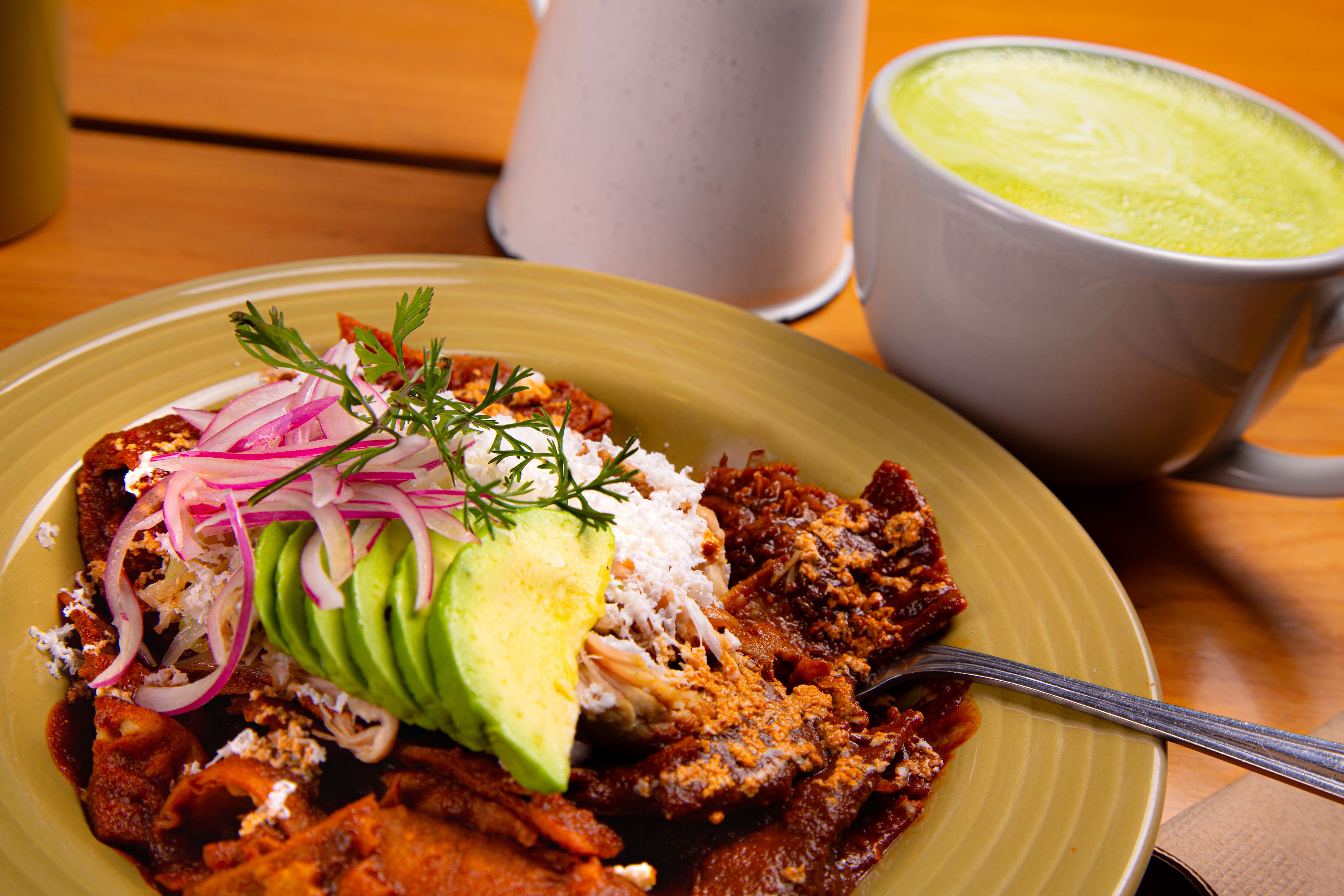Chilaquiles con lechón horneado, servidos en salsa de chile pasilla, acompañados de queso cebolla y aguacate.