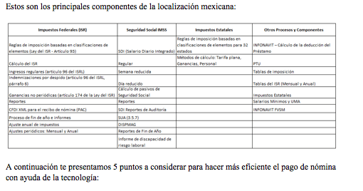 En el proceso de la nómina existen componentes (percepciones, deducciones e impuestos) que a la hora de ser calculados deben ser por demás precisos para procesar los pagos, también, es de suma importancia deben apegarse a la norma legal del país. La localización mexicana permite que este cumplimiento sea siempre correcto y oportuno ya que cuenta con todos los elementos que lo sustentan (tablas, factores, reglas, etc.)