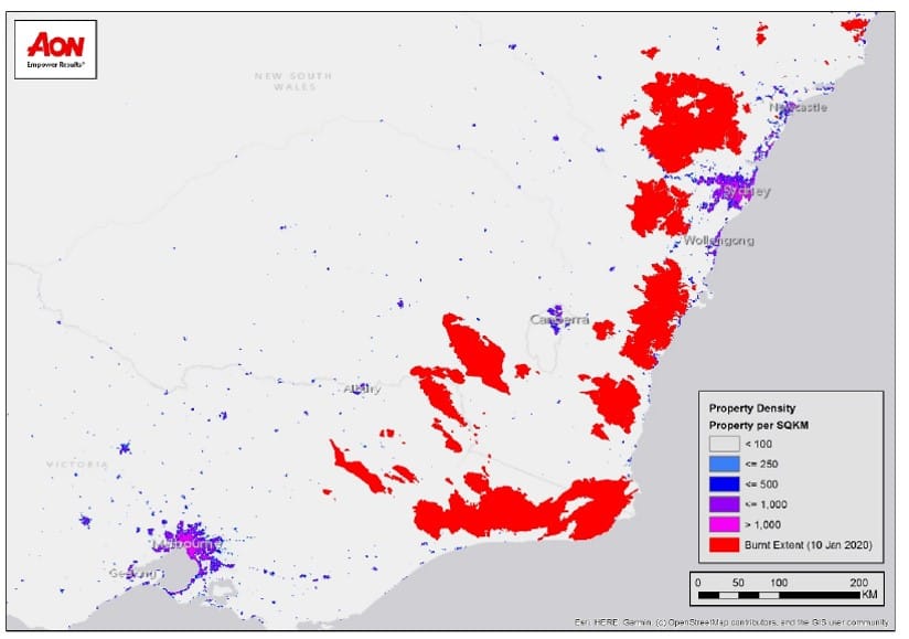 ¿Cómo las aseguradoras miden la “exposición de la propiedad”? Pongamos como ejemplo las temporadas de incendios californianos de 2017 y 2018 que arrasó con un área combinada de menos de 1.8 millones de hectáreas (18,000 km2), pero que tenía aproximadamente entre 30 y 40 edificios destruidos por km2. Comparativamente con los eventos actuales en Australia, las pérdidas han significado menos de 0.1 edificios destruidos por km2, es decir, hay aproximadamente 4.5 km2 de área quemada por cada propiedad expuesta individual.