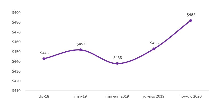 | Fuente: The Competitive Intelligence Unit con información de los operadores Así, se registra una contabilidad de 22.6 millones de líneas fijas al 2T-2021, esto es 6.7% más que un año atrás, nivel impulsado también por la oferta de servicios empaquetados de doble, triple hasta cuádruple play que generan economías e incentivos de contratación para usuarios residenciales y empresariales. Por su parte, los accesos de banda ancha fija ascienden a los 23.1 millones y registran un crecimiento anual de 10.9% durante el periodo referido, principalmente como consecuencia del empujón y acelerada transición hacia una economía digital y plena adopción de la conectividad entre los hogares del país. Gasto y Consumo de Servicios de Conectividad Por su parte, en su reporte sobre “Contratación y Patrones de Consumo de los Usuarios de Servicios de Telecomunicaciones Fijas Antes y Durante la Pandemia ocasionada por la Covid-19”, el IFT evidencia la profundización en el uso y gasto en la conectividad durante esta crisis sanitaria y económica.[1] Destaca en su informe que son cada vez más los usuarios que optan por contratar de manera empaquetada servicios fijos de telecomunicaciones (63.2% del total), así como aquellos que han elegido mayores velocidades de descarga de datos al contratar banda ancha fija, tal que aumentó en 18.3 puntos porcentuales la proporción del total de usuarios que cuentan con un ancho de banda igual o mayor a los 20 Mbps (64.7%). En lo que toca al consumo de la conectividad, la proporción de usuarios que utilizan internet de banda ancha fija más de cinco horas al día pasó de ser 31.2% a 51.1% del total en el último año, derivado de la intensificación en el uso de aplicaciones y herramientas digitales. Mientras que, en términos de gasto, el monto promedio mensual destinado en la contratación de internet fijo ascendió a $482 pesos al cierre de 2020, esto es 6.4% superior al registrado en su medición previa de 2019 ($453 pesos al mes). Gasto Promedio Mensual en Servicio de Banda Ancha Fija (Pesos) |