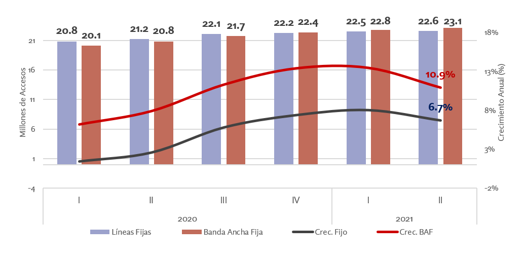 | Los servicios de telecomunicaciones fijas incluyen a la telefonía y banda ancha fija disponibles en hogares y unidades económicas del país. Especialmente este último ha sido esencial durante el curso de la pandemia para la realización de nuestras actividades educativas, sociales, productivas, culturales, entre otras. Durante el año y medio de crisis pandémica, las redes de telecomunicaciones fijas han probado su robustez en capacidades y soporte de transmisión de los vatos volúmenes de tráfico de voz, datos y video que se realizan en un flujo permanente por el uso de aplicaciones de comunicación a distancia, entretenimiento, productividad y plataformas de contenidos. Precisamente, en el transcurso de este tiempo es manifiesto un ‘empujón digital’ en la contratación y uso de la conectividad fija, tal que se ha acelerado el ritmo de crecimiento de las líneas de telefonía y los accesos a la banda ancha, a partir de la creciente necesidad y relevancia de contar con estos servicios para la realización de los quehaceres cotidianos. Accesos y Dinamismo de los Servicios Fijos La contratación de telecomunicaciones fijas registra una trayectoria ascendente desde el primer trimestre de 2020 al mismo periodo de 2021, a partir de la implementación de medidas de asilamiento, preventivo o de control, y el posicionamiento de la conectividad fija como principal vía de comunicación desde el inicio de la crisis pandémica. Si bien al segundo trimestre de 2021 (2T-2021), la tendencia de crecimiento de ambos servicios (telefonía y banda ancha fijas) se ha desacelerado, mantiene niveles más altos que los previos al comienzo de la pandemia. Accesos de Telefonía y Banda Ancha Fija (Millones y Crecimiento Anual, %) |