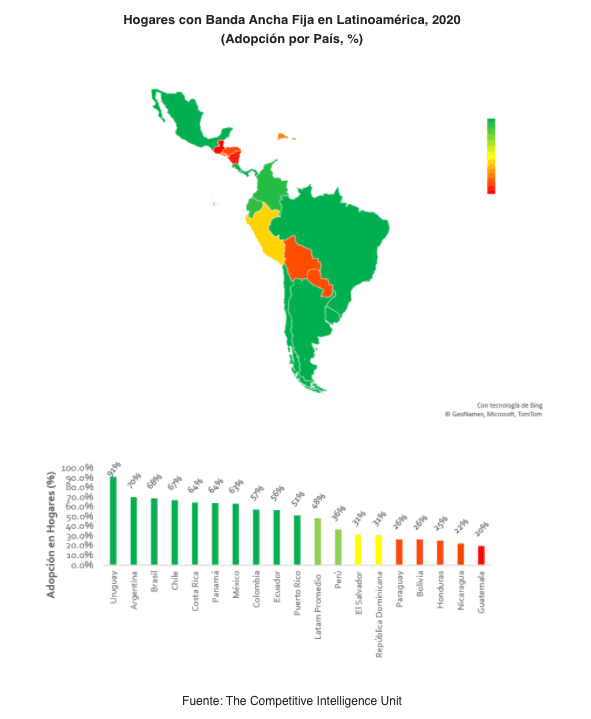 Al cierre de 2020, la región registró una contabilidad agregada de 92.4 millones de accesos a la BAF, lo que se traduce en un promedio de adopción del servicio de 48% entre los hogares de los países que integran la región. Entre estos destacan Uruguay (91%), Argentina (70%), Brasil (68%), Chile (67%), Costa Rica (64%), Panamá (64%), México (63%), Colombia (57%), Ecuador (56%) y Puerto Rico (51%), países que superan un coeficiente de 50%.