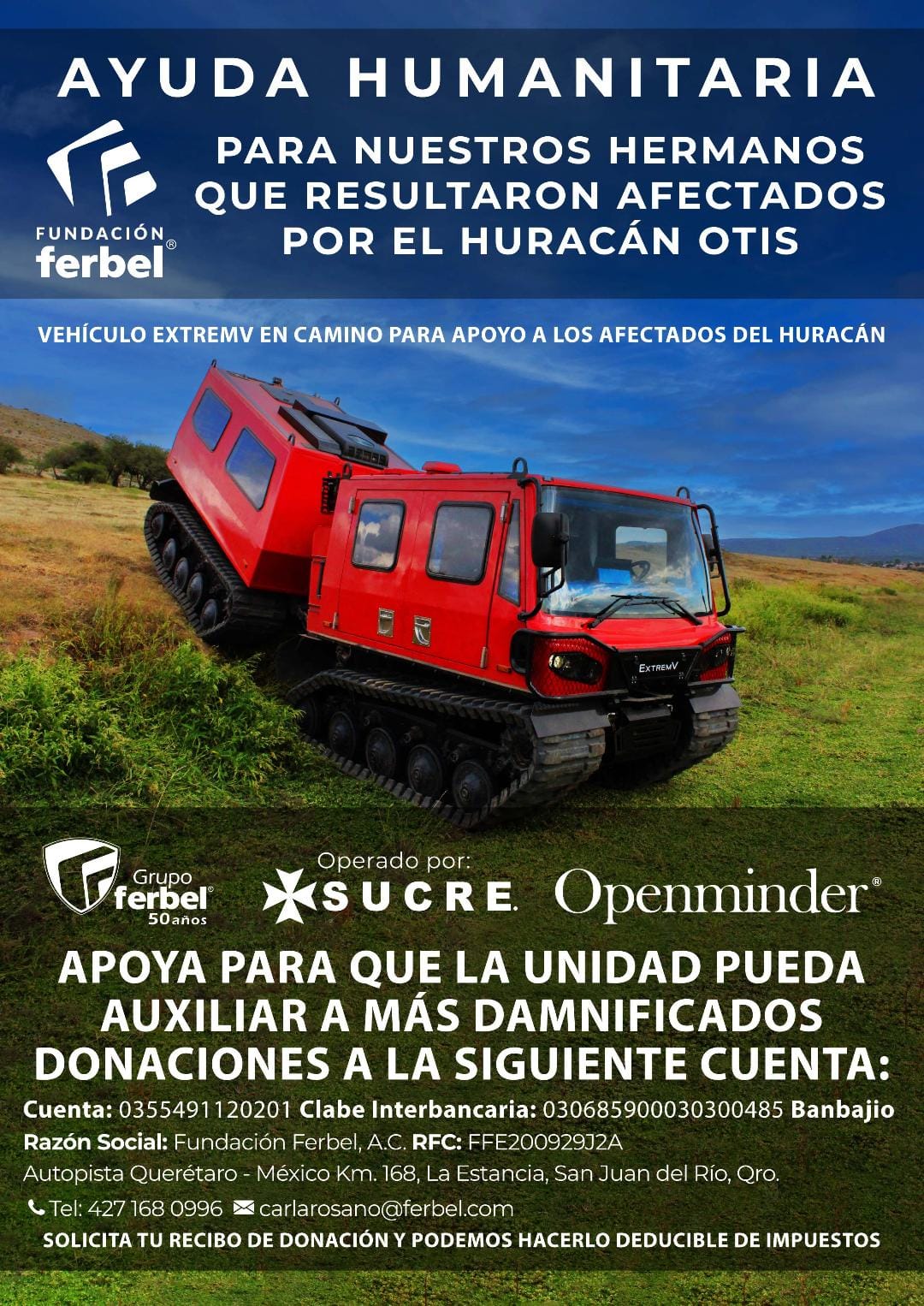 En apoyo a los afectados por el huracán Otis en el estado de Guerrero, Fundación Ferbel, con el apoyo de la plataforma Openminder y la empresa de ambulancias Sucre, envían a la zona afectada el vehículo anfibio de rescate ExtremV, diseñado para la asistencia humanitaria y apoyo en caso de desastre, con capacidades anfibias que le permiten acceder al 80% de los terrenos.