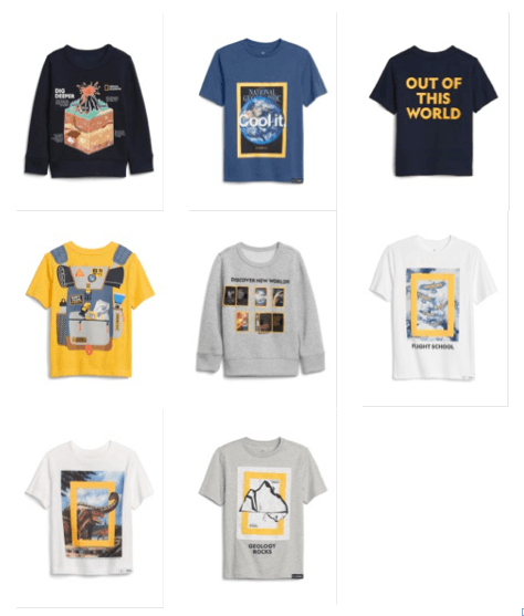 Presentamos la primera colección de Gap con National Geographic ™, con estilos gráficos sustentables y de tendencia para entusiasmar a los jóvenes exploradores a perseguir sus curiosidades en el mundo. Gap se enorgullece de asociarse con National Geographic ™ mientras continúan financiando y apoyando el trabajo fundamental en todo el mundo en las áreas de ciencia, exploración, educación y conservación. Esta colaboración se centra en la aventura, el descubrimiento y la exploración de nuestro planeta. Además, cada pieza de la colección está hecha con materiales reciclados o cultivados orgánicamente.