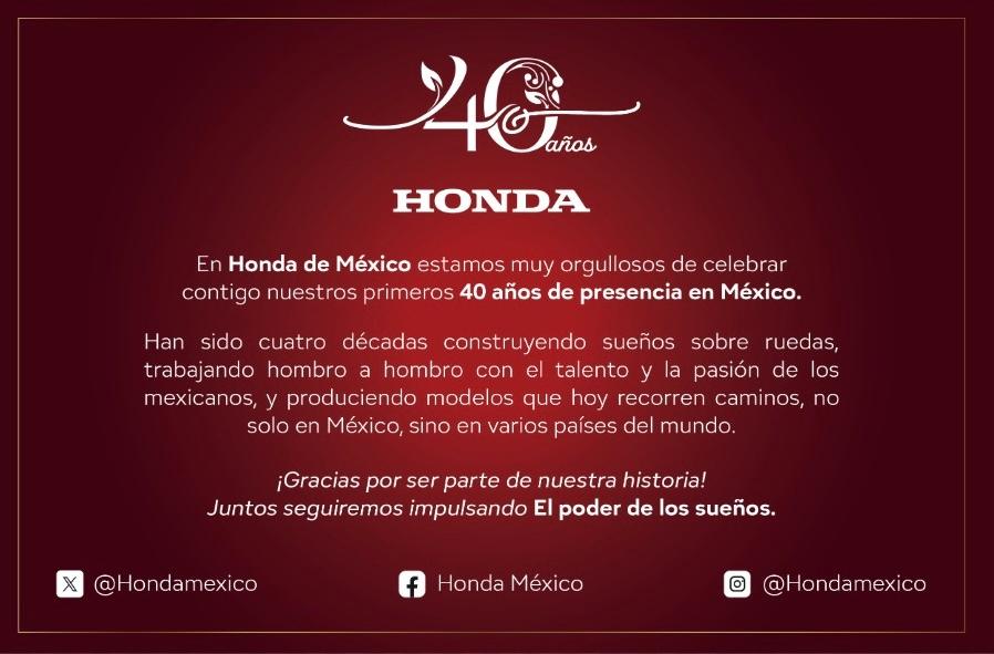 En Honda de México estamos muy orgullosos de celebrar contigo nuestros primeros 40 años de presencia en México.