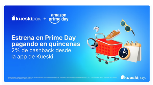 Este año, Amazon y Kueski se unen para ofrecerte aún más ventajas. Al pagar con Kueski Pay, puedes obtener $200.00 MXN de descuento en compras desde $2,000 usando el código: PRIMEKUESKI. Además, recibirás 2% de cashback en cada compra desde la app de Kueski: una forma de recuperar parte de tu gasto para futuras compras o simplemente para ahorrar. Todo esto, pagando en quincenas y sin presiones.