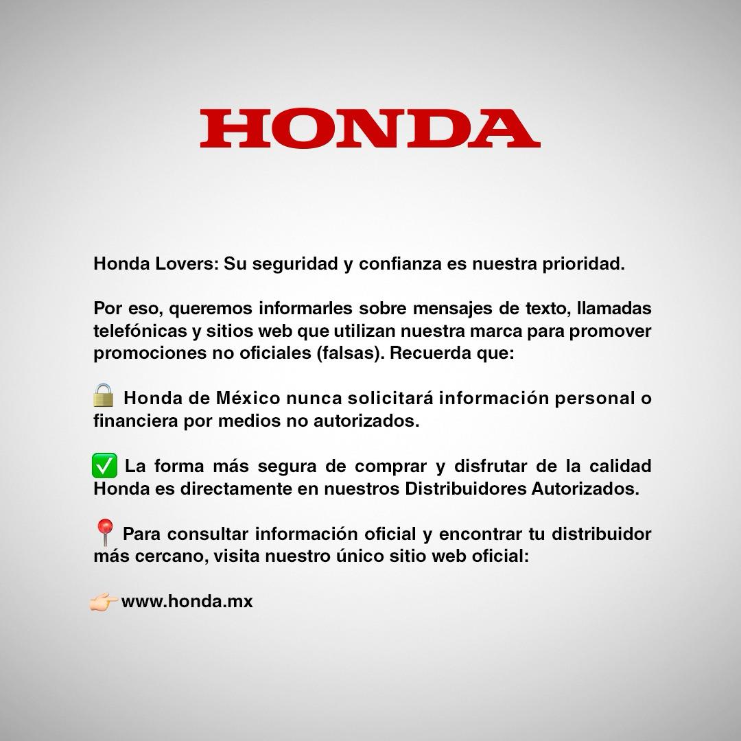 Las formas de engaño incluyen ahora llamadas telefónicas, mensajes de texto y sitios web, suplantando la identidad de Honda de México, para ofrecer promociones que no son oficiales y pudieran tratarse de fraude. La empresa no reconoce en absoluto estas formas de contacto (no oficiales) y emite esta alerta a sus clientes, socios de negocio y público en general, para que tengan cuidado y no se dejen engañar.