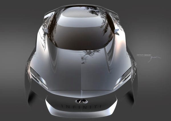 - El frente está compuesto de un panel liso y el logotipo INFINITI iluminado en el centro, con tomas de aire laterales que le permiten desviar el aire alrededor de la carrocería y brindar mayor aerodinámica al vehículo.