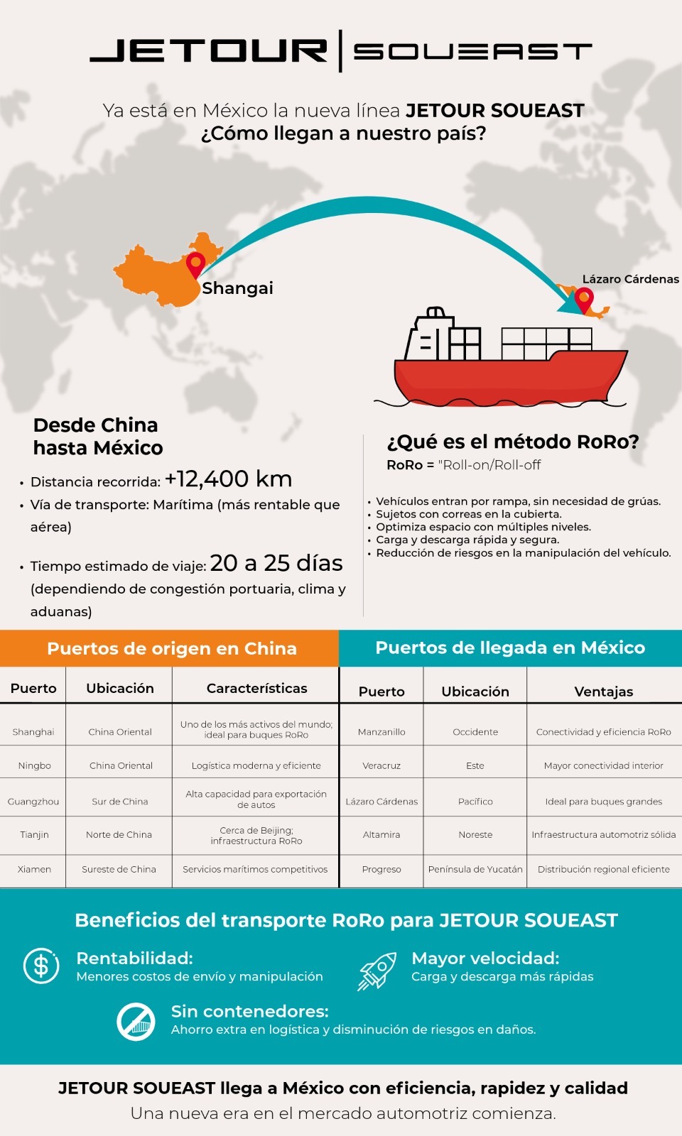 Coompartimos una infografía que ilustra, en forma resumida, el proceso de embarque y llegada de los automóviles chinos, desde que salen de su país de origen, hasta que llegan a México.