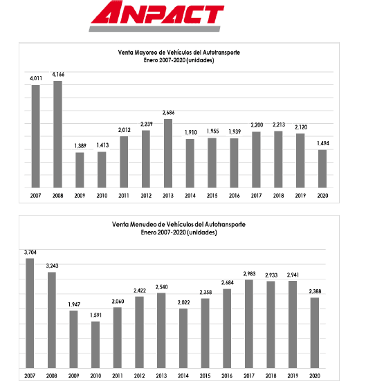 Ciudad de México febrero de 2020. La Asociación Nacional de Productores de Autobuses, Camiones y Tractocamiones (ANPACT), informó que, durante el mes de enero, la venta al mayoreo de vehículos pesados y comerciales alcanzó un total de 1,494 unidades, que comparadas con las 2,120 registradas en enero de 2019, representa una caída del 29.5%.