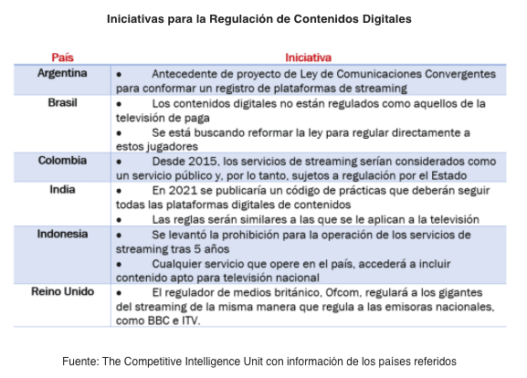 | Es una tendencia mundial de la que México no queda exento, la creciente preferencia de las audiencias por contenidos audiovisuales ofrecidos por plataformas de streaming. Al respecto, las autoridades regulatorias han emprendido la búsqueda de nivelar las condiciones de mercado con otros modelos de difusión tradicionales, como la televisión abierta, restringida o de paga. En efecto, en 2021, las plataformas de streaming se han consolidado como principal vía de acceso a series y películas originales y de estreno. A ello ha contribuido el cierre de salas cinematográficas y la proliferación de alternativas para la visualización de estos contenidos audiovisuales durante el primer año pandémico. Con base en esto, diversos órganos reguladores alrededor del mundo han comenzado a equilibrar las condiciones operativas, tributarias y competitivas que prevalecen en el ecosistema que integra a estas plataformas con jugadores tradicionales. No obstante, hoy se transita a paso veloz hacia un escenario en el que apliquen, a plataformas de streaming, las obligaciones que cumplen la TV abierta y de paga, por ejemplo, aquellas relativas al contenido transmitido y de atención al consumidor. Reino Unido a la Vanguardia de la Nivelación Regulatoria El gobierno británico ha emprendido una iniciativa desde su Ministerio de Cultura para actualizar las reglas aplicables a jugadores de radiodifusión (BBC, ITV y Channel 4) y buscar nivelar el terreno competitivo con las plataformas de video bajo demanda por internet. El objetivo es que estas últimas cumplan con los estándares de imparcialidad, equidad, daño y ofensa que hoy son aplicables a jugadores tradicionales. Al mismo tiempo, se incorporaría a los servicios de streaming dentro del marco normativo que regula la provisión de contenidos directos al consumidor bajo la supervisión y jurisdicción de Ofcom, autoridad reguladora de la radiodifusión, telecomunicaciones y el servicio postal en el Reino Unido. Con ello, se coloca la primera piedra para conformar un ecosistema equitativo de distribución de contenidos audiovisuales. Otras Propuestas a Nivel Internacional En lo que va del año, dos países asiáticos han extendido las obligaciones en materia de contenido a las plataformas de streaming que operan en el país. En el caso de India ya comienzan a implementar reglas similares a las aplicables a jugadores de televisión y durante 2021 se emitirá un código de prácticas para los servicios digitales. Por su parte, Indonesia levantó la prohibición que tenía sobre Netflix y otras plataformas al comprometerse a seguir las reglas en materia de violencia, pornografía y terrorismo, así como responder a quejas de los consumidores en un periodo menor a 24 horas. En la región de Latinoamérica, países como Argentina, Brasil y Colombia ya cuentan con precedentes que buscan equiparar las obligaciones en el mercado de contenidos audiovisuales, con proyectos e iniciativas que regulen de la misma manera a plataformas de streaming como se hace a la TV abierta y de paga. Por ejemplo, en Colombia un proyecto de Ley de 2015 pretendía que los contenidos de estas fueran supervisados por una entidad estatal, así como evitar el fenómeno de concentración en la industria dejando de lado el interés público de las audiencias. Mientras que en el caso de Brasil habría una decena de proyectos para regular de manera directa a los jugadores digitales. Estas iniciativas en curso en el plano internacional sientan las bases para avanzar en la materia en México, con un sistema normativo que regule de manera equitativa la operación y las transacciones que tienen lugar en el mundo físico, así como en aquel digital. Sin duda, son pasos primeros de un proceso continuo de ajustes al marco regulatorio global, del que México no está exento y que en el mediano y largo plazos contribuirán a emparejar el piso competitivo tanto entre países, como entre empresas en esa dualidad de lo físico y lo digital. |