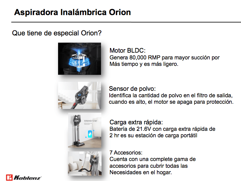 Se trata de las aspiradoras inalámbricas Orión y Venus, que entre los múltiples beneficios que ofrecen es que cuentan con una batería que tienen autonomía de 30 minutos y se recarga de forma extra rápida en tan solo 2 horas, son súper cómodas, prácticas, cuentan con accesorios que logran llegar a cualquier rincón, son versátiles ya que son capaces de adaptarse a cualquier situación y muy fáciles de usar.