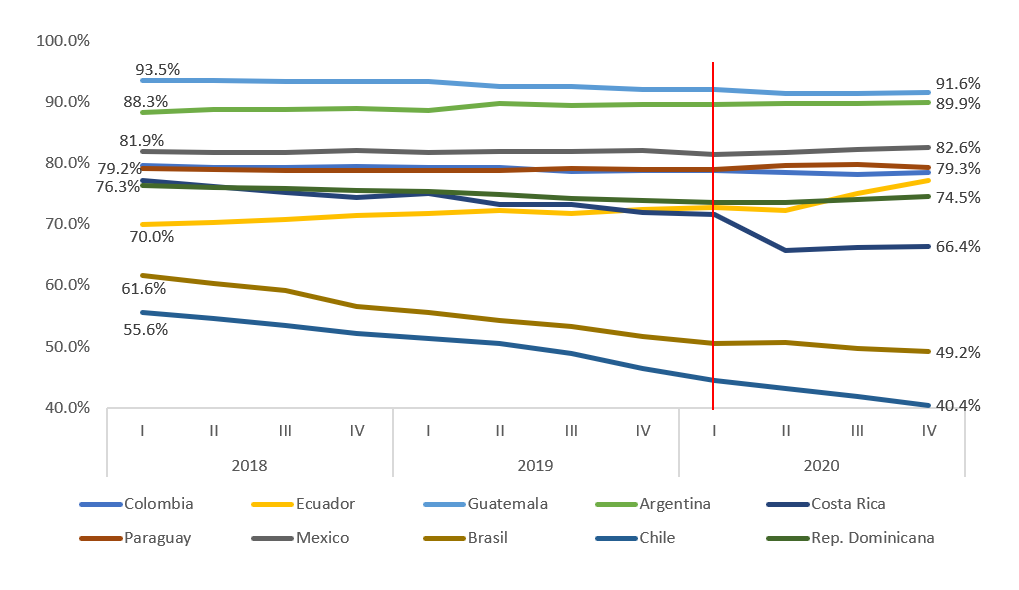 | El modelo de negocio de los operadores móviles en Latinoamérica se encuentra en una fase de transición al impulsar la migración del segmento prepago hacia el de pospago en la mayoría de los países de la región, con base en condiciones propicias y atractivas para la contratación de esta modalidad. No obstante, esta trayectoria favorable para el pospago ha sido puesta en tela de juicio por la mejora en las condiciones de la oferta de prepago. Así, en algunos de estos países es discernible una competencia frontal entre ambas modalidades de pago, al incorporar beneficios diferenciados para los usuarios. La velocidad de transición, hábitos de consumo y contratación de servicios por parte de los usuarios dependen de las condiciones particulares de bancarización, conectividad, ingreso, habilidades digitales, provisión de servicios, portabilidad, entre muchos otros factores que influyen en la decisión de modalidad de pago. A ello es que se enfocan las estrategias comerciales de los operadores. En la mayoría de los países, las condiciones regulatorias han sido conducentes para mejoras en la provisión de servicios móviles. Mecanismos como la portabilidad, la reducción de tarifas de interconexión, la desaparición de la larga distancia y el roaming nacional e incluso internacional, la disponibilidad de recursos espectrales para la oferta de más y abundantes servicios móviles, han dinamizado la oferta comercial tanto del prepago como pospago. A continuación, se presenta una fotografía cuantitativa de este mercado regional al cierre de 2020. En primer lugar, se exhibe la evolución del prepago en Latinoamérica y los efectos manifiestos de la crisis sanitaria en este subsegmento móvil. Segundo, se detalla el panorama de contratación de servicios móviles en la modalidad de pospago, destacando el rezago histórico de algunos países en la región, así como, los posibles efectos de la crisis pandémica. Prepago: Evolución en Latinoamérica El rebalanceo del mercado y ligera preferencia de los usuarios hacia la modalidad de recargas se explica por diversos factores. Por un lado, en los últimos años, en la gran mayoría de los países los operadores han lanzado atractivas ofertas comerciales en prepago, con ofertas de navegación en Internet ilimitada, de aplicaciones de mensajería instantánea y redes sociales, lo que reduce los incentivos a contratar un plan de pospago. Adicionalmente, las empresas han llevado a cabo una estrategia de reducción de subsidios de equipos móviles, que ha sido reemplazada por una política de financiamiento. Aunado a esto, la incursión de operadores móviles virtuales (OMV), con ofertas de prepago enfocadas a nichos específicos ha abonado al crecimiento de usuarios que realizan recargas. Modalidad Prepago en Latinoamérica(Proporción del Total de Usuarios de Telefonía Móvil, %) |