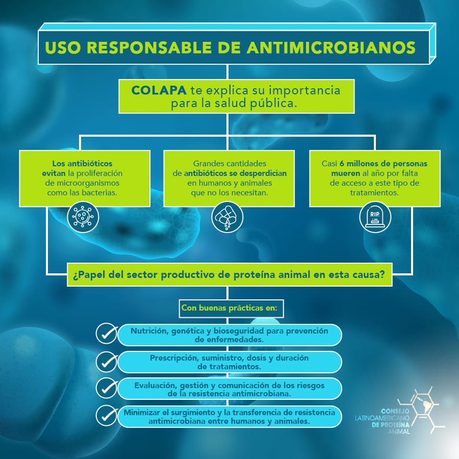 Como un grupo dedicado a la promoción de los beneficios del consumo de proteína de origen animal y su producción sustentable, el Consejo Latinoamericano de Proteína Animal (COLAPA) reconoce su obligación ética para promover el uso responsable de antimicrobianos, así como la importancia de proteger la salud de los humanos y de los animales, a la par de garantizar la inocuidad en los alimentos.