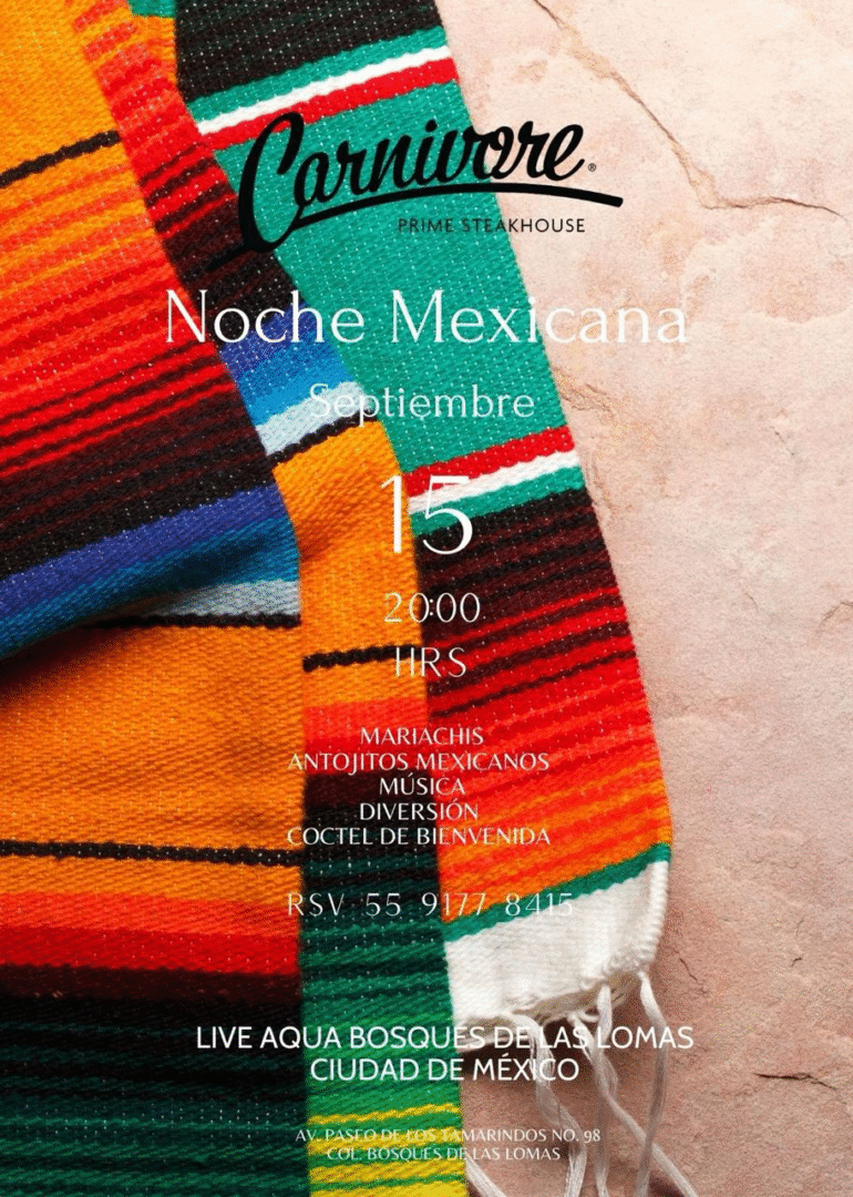 Carnivore Prime Steakhouse de Live Aqua Bosques prepara la Noche Mexicana el 15 de septiembre a las 20:00 horas en Live Aqua Bosques de las Lomas, donde los asistentes podrán disfrutar de una velada con mariachi, música en vivo, antojitos mexicanos, diversión y un cóctel de bienvenida.