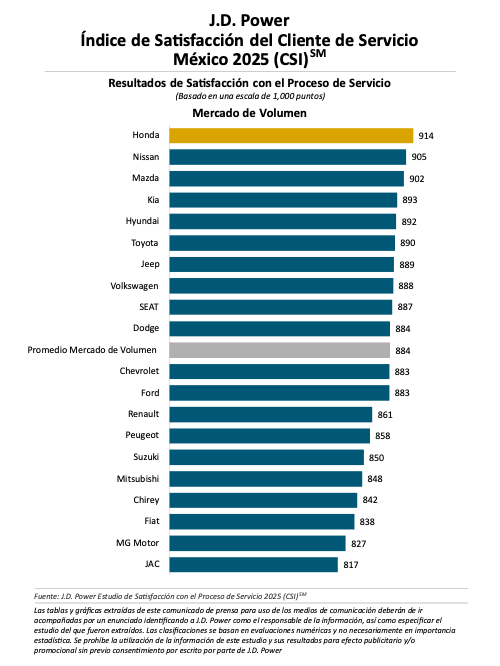 “El servicio en el distribuidor es donde las promesas de la marca a los clientes se cumplen o no, y las marcas chinas, en general, siguen trabajando para ganarse la confianza de los clientes”, afirmó Gerardo Gómez, director general de J.D. Power de México. “Para cerrar esta brecha, estos distribuidores deben centrarse en una comunicación honesta, reconocer y corregir cualquier error con prontitud, y brindar constantemente la experiencia técnica que genera confianza en el cliente en cada visita. Además, se debe priorizar la mejora de servicios como el acceso a internet inalámbrico en la sala de espera y reforzar las prácticas de recepción al cliente. Históricamente, las marcas japonesas han marcado la pauta al cumplir constantemente con estos aspectos del servicio”.