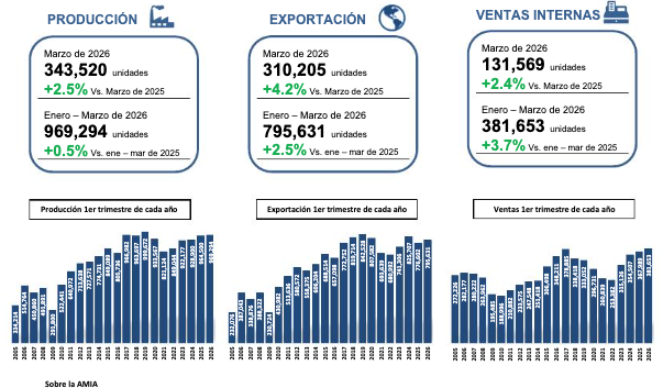 Ciudad de México, abril de 2026. – La Asociación Mexicana de la Industria Automotriz (AMIA) difunde el reporte de producción, exportación y ventas internas de vehículos ligeros al mes de marzo de 2026, con base en la información publicada por el Instituto Nacional de Estadística y Geografía (INEGI).