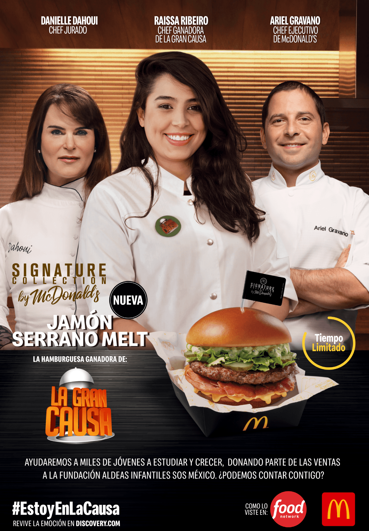 En “La Gran Causa” estuvo en juego mucho más que un premio en efectivo de US$ 10 mil que ganó la chef amateur Raissa Ribeiro de Brasil. La Jamón Serrano Melt está a la venta en los locales de McDonald’s de México, Brasil, Colombia y Argentina, y parte de lo recaudado será destinado a ONG’s que trabajan para que los jóvenes de América Latina puedan contar con más oportunidades para su futuro. Esas entidades son: Fundación Sí en Argentina, Ayrton Senna en Brasil y Aldeas Infantiles SOS en Colombia y México.