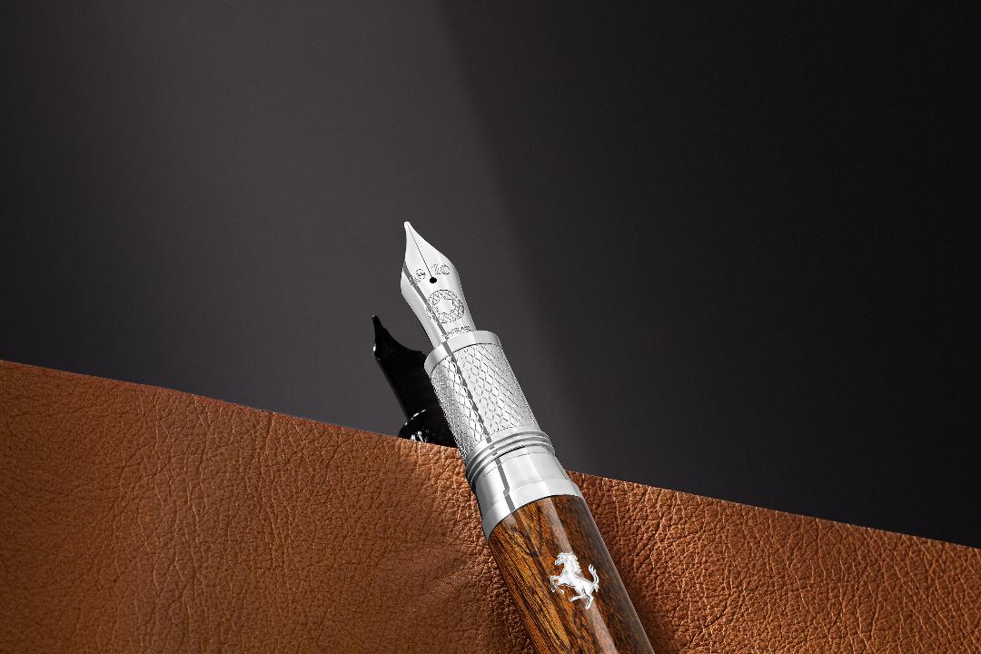 El plumín artesanal Montblanc en oro macizo Au750 rodiado es una referencia a la larga tradición artesanal, como la de los paneles forjados a mano en los coches Ferrari GT de mediados del siglo pasado. El grabado en relieve del plumín hace alusión a esta colaboración especial entre la Maison y Ferrari, ya que muestra el emblema Montblanc rodeado por un patrón de rejilla.