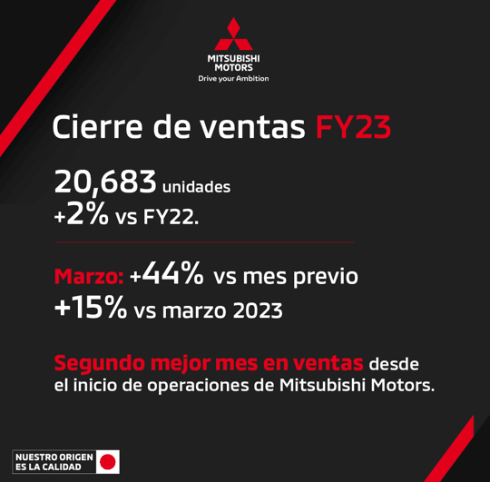 Ciudad de México, abril de 2024.Mitsubishi Motors de México (MMDM), al igual que otras marcas automotrices japonesas, mide sus ventas basadas en el año fiscal japonés que abarca de abril 2023 a marzo 2024, es por eso que al cierre de este mes, la marca reportó 2,679 unidades comercializadas durante marzo, lo que representa +44% vs el mes anterior y +15% vs marzo del 2023, convirtiéndose en el segundo mejor mes en ventas desde el inicio de operaciones de la marca en el país.