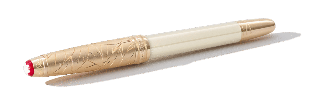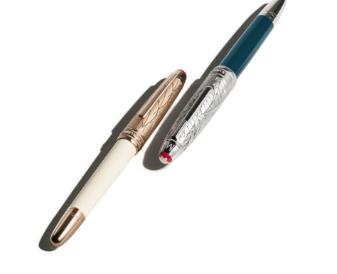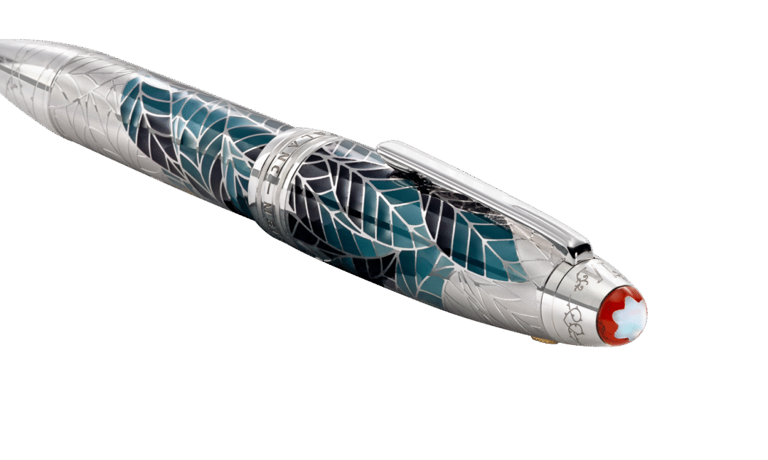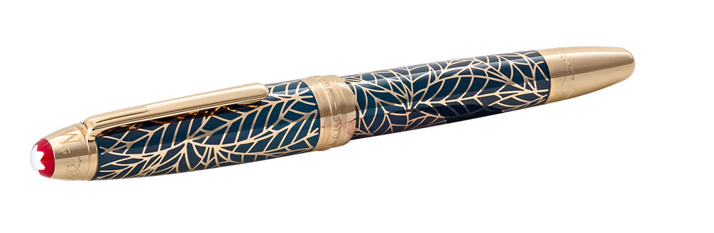 Esta edición aúna las dedicadas a Romeo y Julieta en un diseño único para simbolizar la unión entre dos mundos. El capuchón y el barrilete, realizados en laca de color verde azulado con efecto degradado, se adornan con un motivo de hojas con un borde revestido de oro distintivo para evocar el exuberante jardín de los Capuleto. En la caperuza del capuchón, el emblema Montblanc blanco está enmarcado en un rojo a contraste, mientras que las letras “C” y “M” se entrelazan en una referencia a las familias cuya rivalidad sella el destino de los amantes: este final trágico también se plasma con las ramas espinosas en la caperuza del capuchón y el cono. El plumín de oro macizo Au750 decorado con el grabado “R & J” rinde homenaje al vínculo imperecedero que transciende la rivalidad.