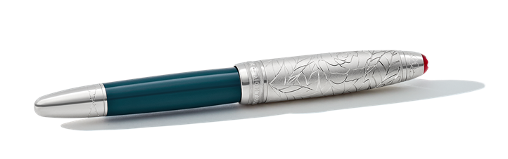La edición Meisterstück Romeo LeGrand de resina preciosa, con un diseño de resina preciosa en un intenso verde azulado inspirado en la escena íntima en el jardín de los Capuleto, incorpora un motivo de hojas en el capuchón y detalles platinados. La caperuza del capuchón cuenta con la letra “M” de Montesco, el emblema Montblanc engastado en resina preciosa roja como símbolo del espíritu impetuoso de Romeo y el dramático motivo de ramas espinosas,que también se extiende por el cono. El plumín de oro macizo Au585 rodiado está grabado con el nombre “Romeo”.