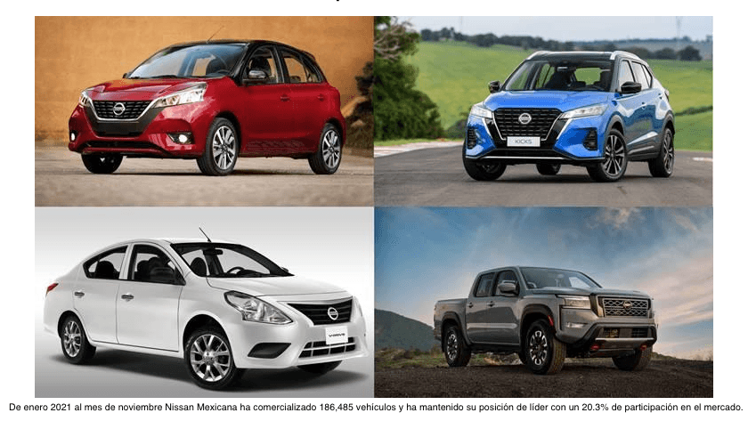 Foto 1_ En enero 2021 al mes de noviembre Nissan Mexicana ha comercializado 186,485 vehículos y ha mantenido su posición de líder con un 20.3% de participación en el mercado.