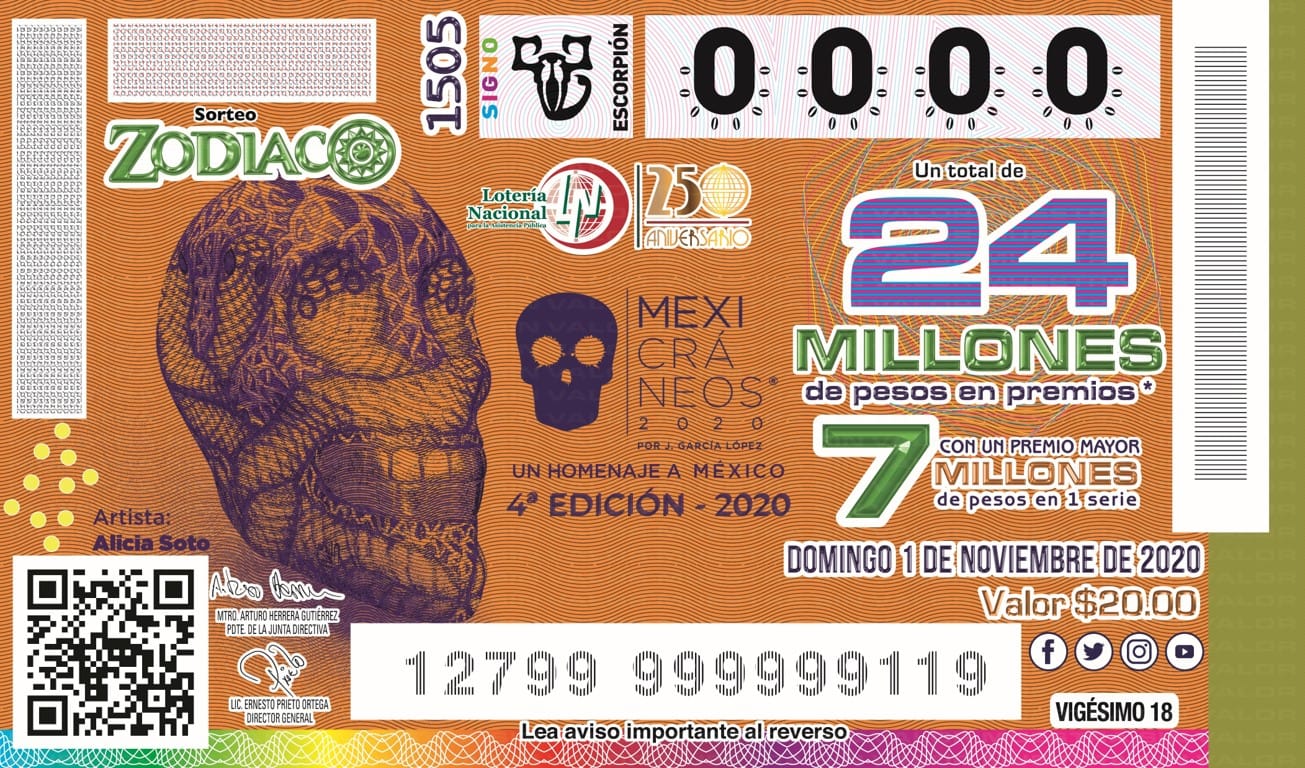 | Lotería Nacional para la Asistencia Pública y Mexicráneos celebran Día de Muertos. Sorteo Zodiaco 1505 Mexicráneos el 1° de Noviembre, con un premio mayor de 7 millones de pesos y un total repartible de 24 millones de pesos en premios. El billete conmemorativo integra el litocráneo de Alicia Soto, con la Coatlique. |