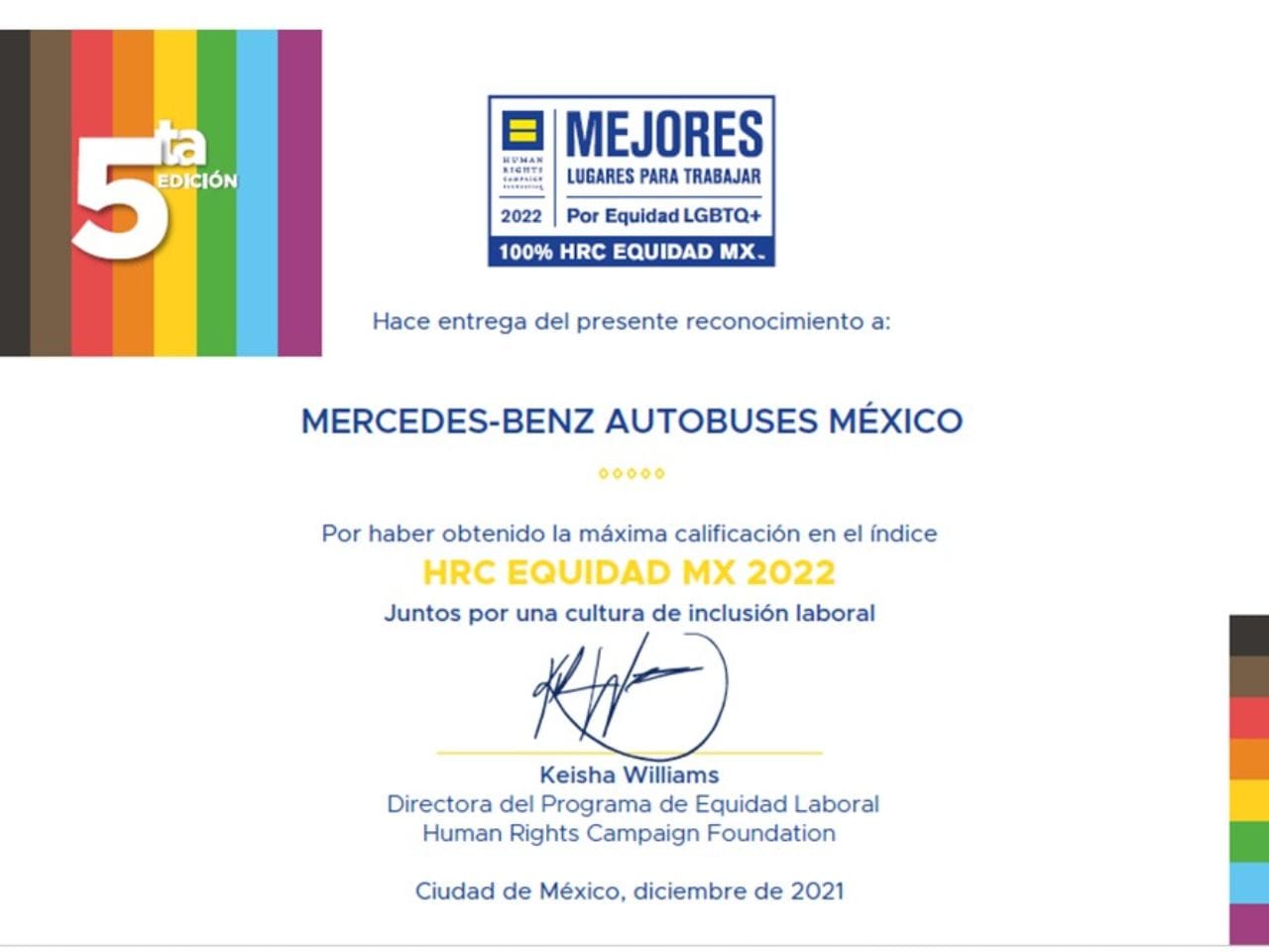 Mercedes-Benz Autobuses recibió por tercer año consecutivo, el certificado HRC Equidad MX, por implementar y promover políticas de no discriminación, creación de grupos de recursos para trabajadores o consejos de diversidad e inclusión, así como actividades públicas para apoyar la integración LGBT.