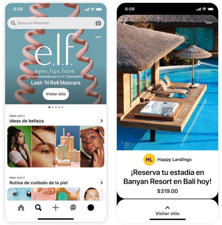 Millones de usuarios de todo el mundo interactúan con contenidos de viajes en la plataforma todos los meses, utilizan Pinterest para planear sus viajes y manifestar sus aventuras. (Fuente: Datos internos de Pinterest, global, octubre de 2022). Ahora, con Catálogos de viajes, los usuarios pueden pasar de la inspiración a la reserva de sus vacaciones de ensueño de forma más sencilla que nunca. Cuando un usuario de Pinterest planee viajar, simplemente puede hacer clic en el Pin de Catálogos de viajes de una marca y realizar la reserva directamente en su sitio web.