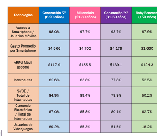 | Fuente: The Competitive Intelligence Unit con información de ENDUTIH, 2021 Generación “X” En esta generación se incluyen a las personas entre 31 a 50 años, quiénes han mostrado adaptarse fácilmente a los cambios tecnológicos, puesto que 93.7% de los usuarios móviles cuentan con un Smartphone. Al ser el segmento con el mayor acceso a productos financieros registran el más alto nivel de contratación de servicios móviles en la modalidad de pospago (22%), lo que se traduce en el segundo mayor ARPU en el comparativo generacional ($139.1 pesos al mes). Destaca que este grupo se encuentra en el tercer lugar de adopción de plataformas de eCommerce (80.1%), al contar con los medios de pago y poder adquisitivo suficiente para realizar transacciones en línea, principalmente adquieren artículos electrónicos, realizan pagos de servicios y operaciones bancarias. Además, más de la mitad de las personas (51.5%) son usuarios de videojuegos, una proporción significativamente más baja con respecto a grupos de menor edad. Baby Boomers A pesar de que el acceso a TIC en esta generación (adultos mayores de 50 años) es el de mayor crecimiento, aún registra un nivel menor frente al resto de grupos de edad, debido a sus hábitos de consumo y habilidades digitales en ciernes. Así, la adopción de servicios de video bajo demanda en internet por suscripción (SVOD) y plataformas comercio electrónico dentro de este segmento etario se ha intensificado en años recientes, destacan las compras de viajes, pagos de servicios y adquisición de prendas de vestir. Si bien esta segmentación de acceso y uso de TIC manifiesta que el avance tecnológico ha permitido la masificación de las herramientas tecnológicas entre generaciones, tal que se ha eliminado prácticamente la brecha tecnológica generacional, destacan diferencias a la intensidad de uso atribuible a los hábitos y preferencia de uso, poder adquisitivo, habilidades digitales, entre otros factores diferenciados entre grupos de edad. |