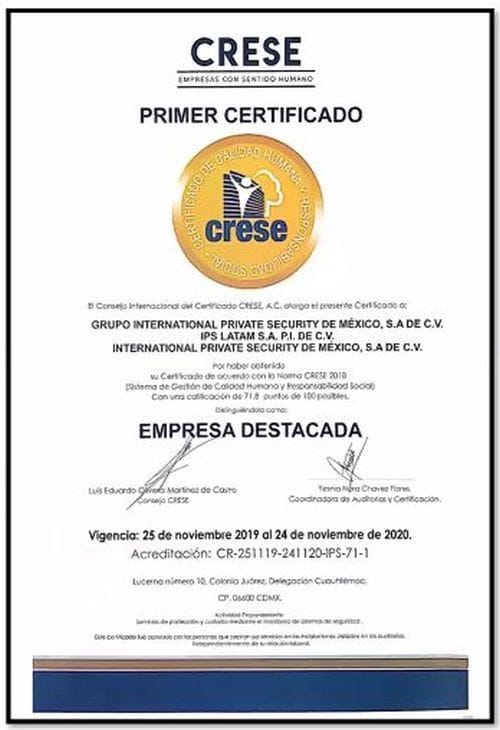 El Consejo Internacional del Certificado CRESE entregó este medio día de manera virtual al Grupo IPS de seguridad privada, el reconocimiento por haber aprobado la Norma en el Sistema de Gestión de Calidad Humana y Responsabilidad Social de las empresas, que busca la humanización o el amor a las personas en el mundo del trabajo.