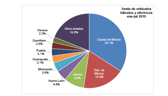 De acuerdo con las cifras publicadas por el INEGI, durante julio 2019 la venta de vehículos híbridos y eléctricos fue de 2,068 unidades, 66.9% por arriba de lo registrado en el séptimo mes del 2018. Las ventas estuvieron compuestas por 12 eléctricos, 78 híbridos conectables y 1,978 híbridos. En el acumulado enero – julio 2019 se comercializaron 12,408 vehículos con estos tipos de tecnologías, los cuales representaron el 1.66% de las ventas totales de vehículos ligeros en el país en los primeros siete meses del 2019.
