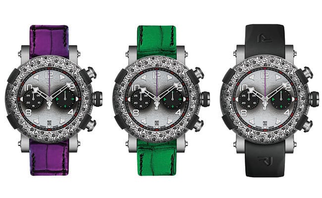 | The Joker chronograph, limited to only 100 pieces, is inspired by the criminal mastermind and perfectly reproduces the aesthetic of the comic strip Super-Villain. Design cues from his flamboyant character appear through the watch, from his lethal razor-tipped playing cards to his striking facial make-up. The dial is a stylistic reinterpretation of The Joker’s face, with an intricately airbrushed finish that evokes the make-up of the Gotham villain. Immediately distinguishable thanks to the iconic rubber RJ BUMPERS™ and neatly shaped lugs, the 45 mm ARRAW case is crowned by a titanium bezel that is laser engraved with an intentionally chaotic The Joker motif. The ARRAW hands are also uniquely stylized with playing card “Aces” at their tips. The back of the titanium case features a bold laser-engraved portrait of the Joker himself. Every Joker watch comes with three interchangeable straps. Two are colorful alligator skin versions in bright green or purple with contrast stitching to match the Joker’s hair and clothing, accompanied by a third strap in black rubber. They can be easily swapped by simultaneously pressing on the Batman logo-engraved screws on the watch lugs. As part of the collectors’ edition, each watch comes with an exclusive deck of The Joker playing cards. |