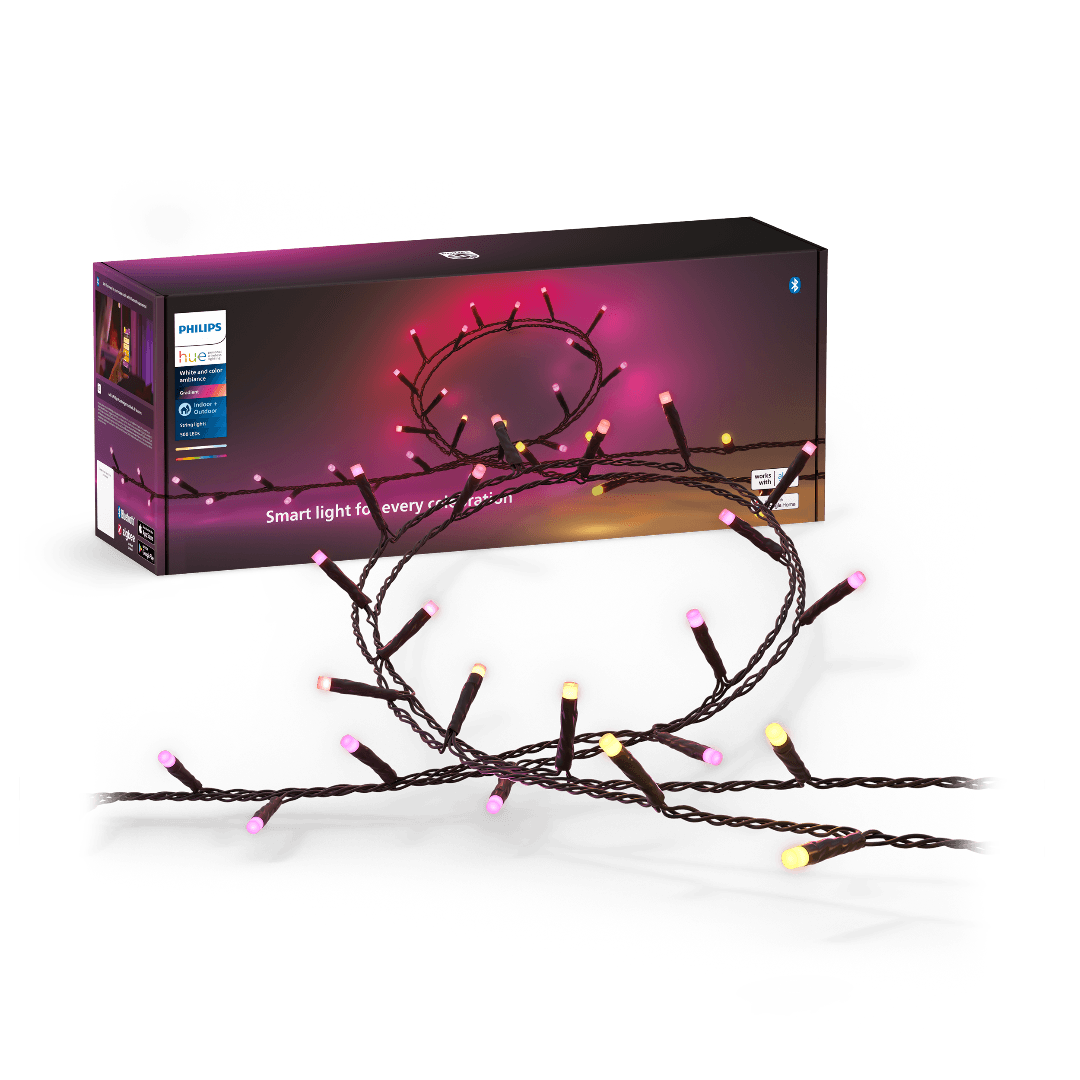 • Disfruta la acogedora atmósfera creada por las luces string Philips Hue Festavia, tanto en interiores como en exteriores, y actualiza tus luces Philips Hue para que funcionen con Matter mediante el Philips Hue Bridge.