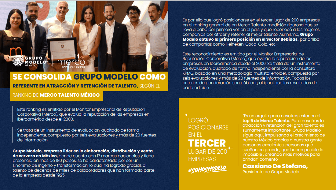 Es por ello que logró posicionarse en el lugar 3 de 200 empresas que participan en el ranking general de Merco Talento, medición rigurosa que se lleva a cabo por primera vez en el país y que reconoce a las mejores compañías por atraer a los mejores candidatos y retener a su gente. Asimismo, Grupo Modelo obtuvo la primera posición en el Sector Bebidas.