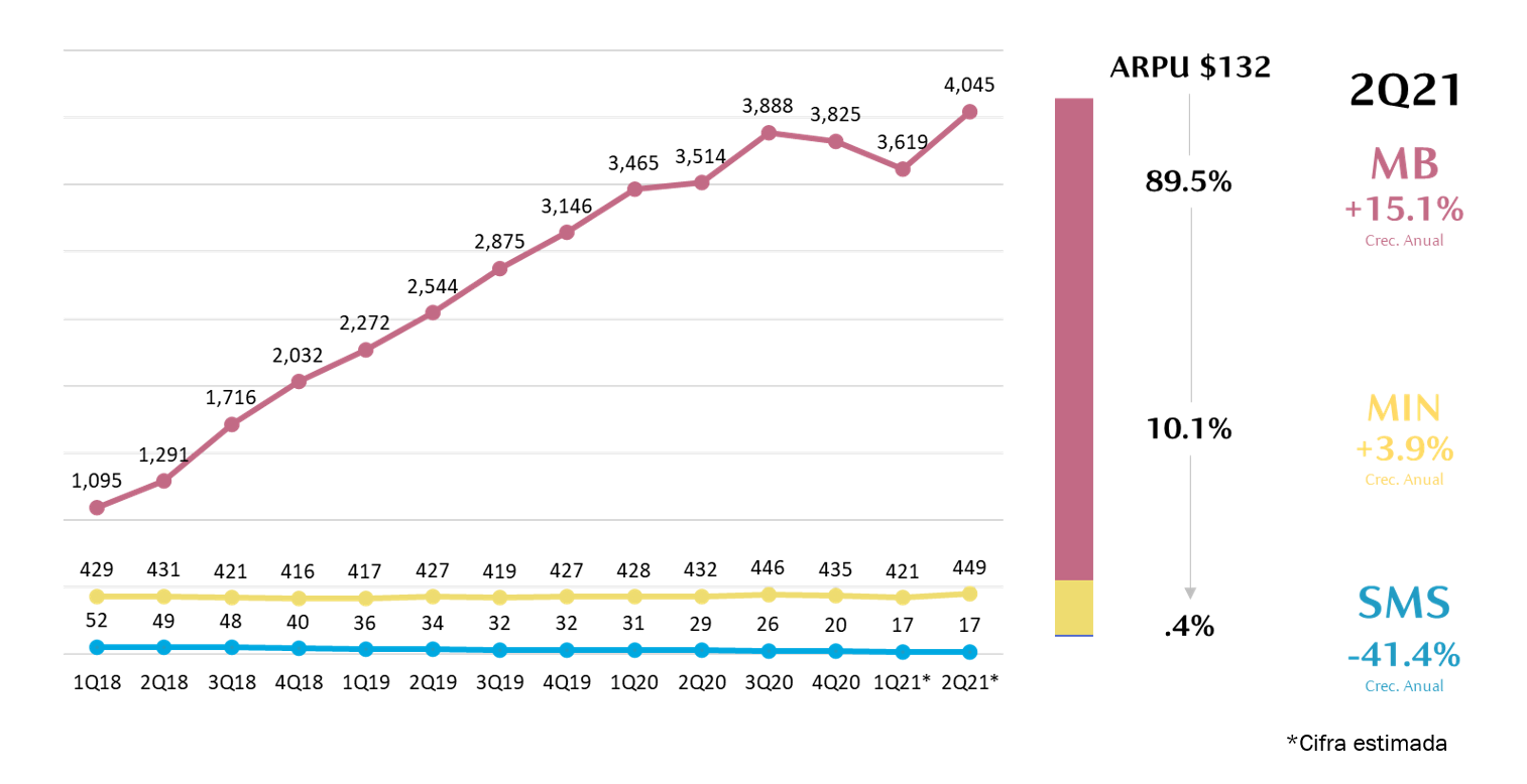| El mercado de telecomunicaciones móviles registra una contabilidad de 127.7 millones de líneas al segundo trimestre del 2021 (2T-2021), 5.1% más que en el mismo trimestre del año anterior. En su segmentación por modalidad de pago, 82.1% o 104.9 millones de líneas corresponden a prepago, mientras que la proporción restante 17.9% o 22.9 millones a pospago. La fase actual del mercado se caracteriza por menores precios y canastas abundantes de servicios móviles, con minutos de llamadas y SMS ilimitados, así como mayores capacidades de descarga de MB de navegación por internet. Asimismo, se identifica un aumento en el consumo/ingreso promedio mensual por usuario (ARPU por sus siglas en inglés), ante la trayectoria ascendente en la realización de llamadas (10.1% del consumo total) y en la descarga de MB de internet (89.5%). En números del 2T-2021, el ARPU alcanzó un nivel de $131.7 pesos al mes, 7.1% mayor a aquel registrado un año atrás. En tanto, el consumo promedio de llamadas realizados por usuario al mes (MOU en inglés) fue de 449 minutos, 3.9% más en su comparativo anual. Por su parte, el segmento de datos es el de mayor dinamismo, tal que el número de MB navegados en internet móvil (4,045 MB) fue 15.1% superior al indicador del año anterior, con marcadas diferencias de consumo entre los usuarios más jóvenes (intensivos) y aquellos adultos mayores (con menores habilidades digitales). Este cálculo resulta de dividir el agregado del tráfico de internet cursado en redes móviles entre la totalidad de los usuarios móviles, es decir, las líneas celulares (127.7 millones). En días recientes se publicó un análisis del Instituto Federal de Telecomunicaciones (IFT) en el que se señala que este indicador llegó a un nivel de 4.9 GB por cada usuario de banda ancha móvil al 4T-2020, es decir todos aquellos que pueden utilizar datos en su celular.[1] Ello es distinto al promedio de 3.8 GB que resulta al utilizar como base a todos los usuarios móviles o con línea celular. Contrario a la evolución y crecimiento en el consumo de MB y el uso de minutos, los SMS se ubican en un promedio de 17 por usuario al mes, que corresponde a una disminución de 41.4% con respecto al mismo trimestre del año anterior. Consumo de Servicios Móviles al 2T-2021 (Minutos, SMS y MB en Promedio al Mes por Usuario) |